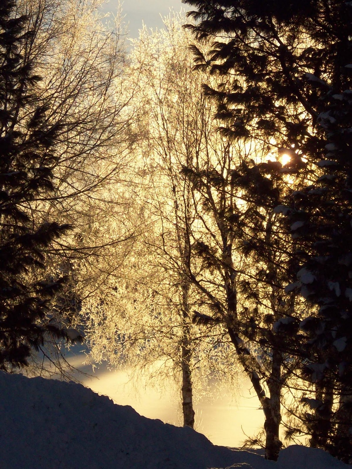 Otroligt starkt ljus den här dagen, och du kan ana solen bakom träden. 18 grader kallt.