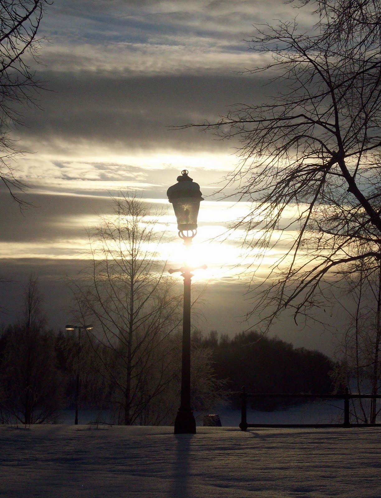 Jag börjar med en bild tagen i Döbelns Park i Umeå. Ett fantastiskt ljus lyser genom de tunna skyarna, och det så till den grad att de ”äter” upp lyktan i parken.