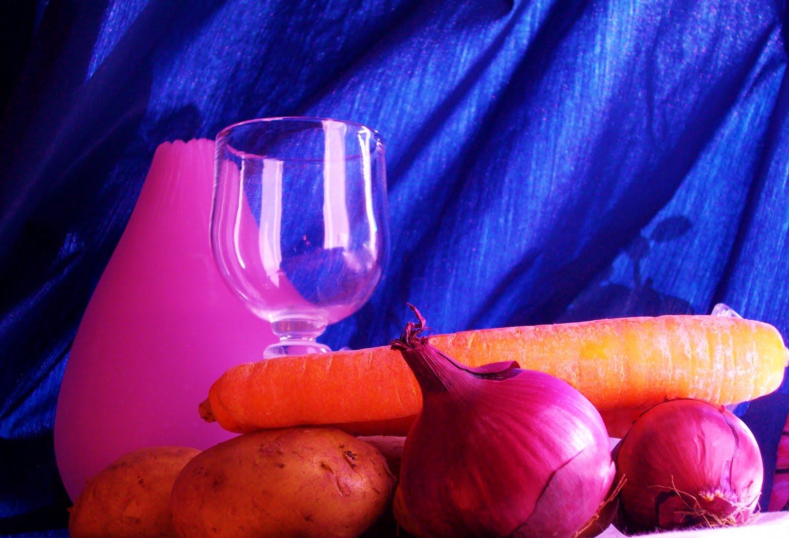 Men jag gör ett försök, och alla tre bilder är byggda runt min dotters glas-design (vas, skål, vin-glas) och rotsaker(morot, potatis, rödlök).