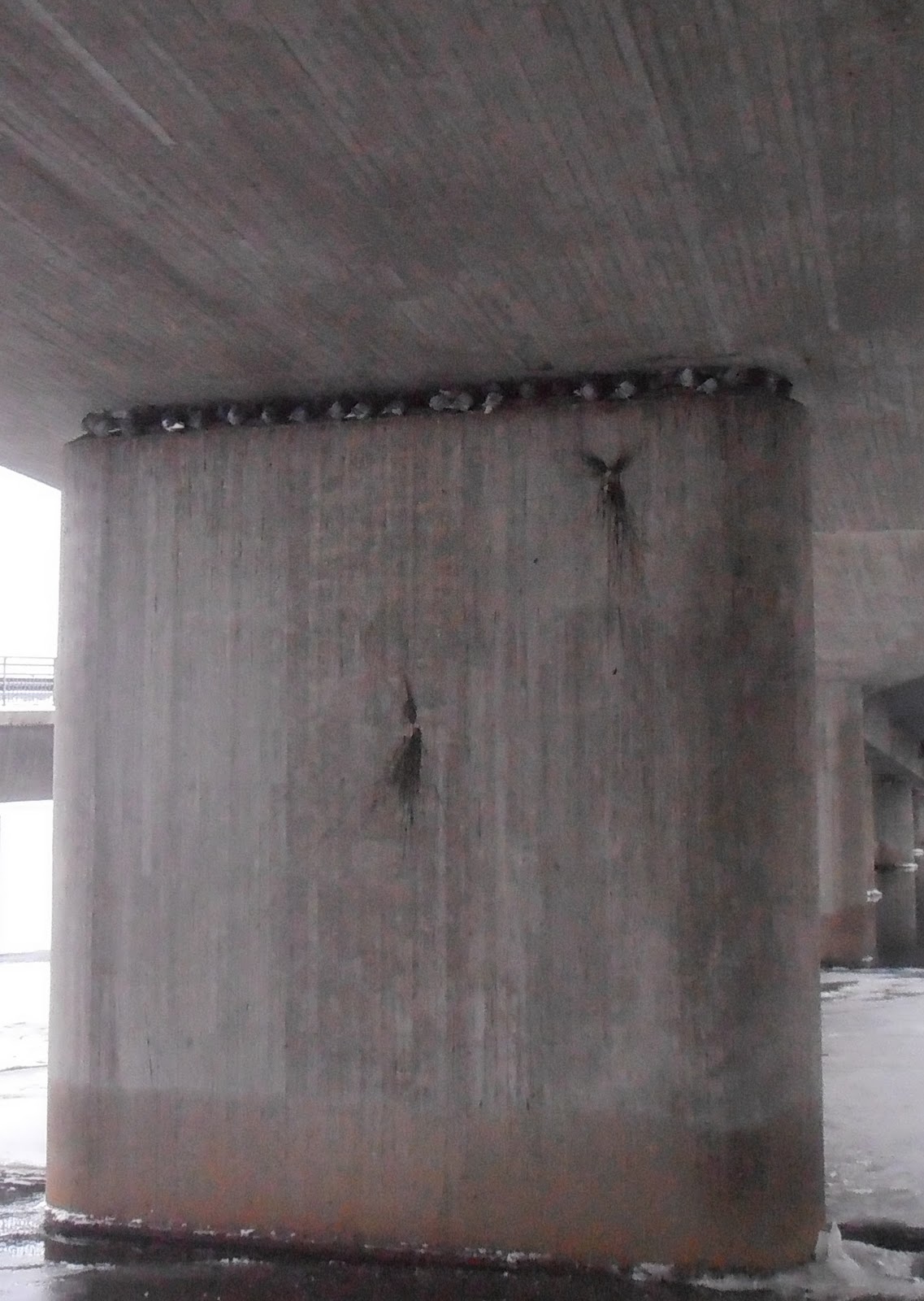 Tre bropelare under kyrkbron i Umeå, och om ni tittar noga finns mängder med duvor mellan den första bropelaren och brons undersida.