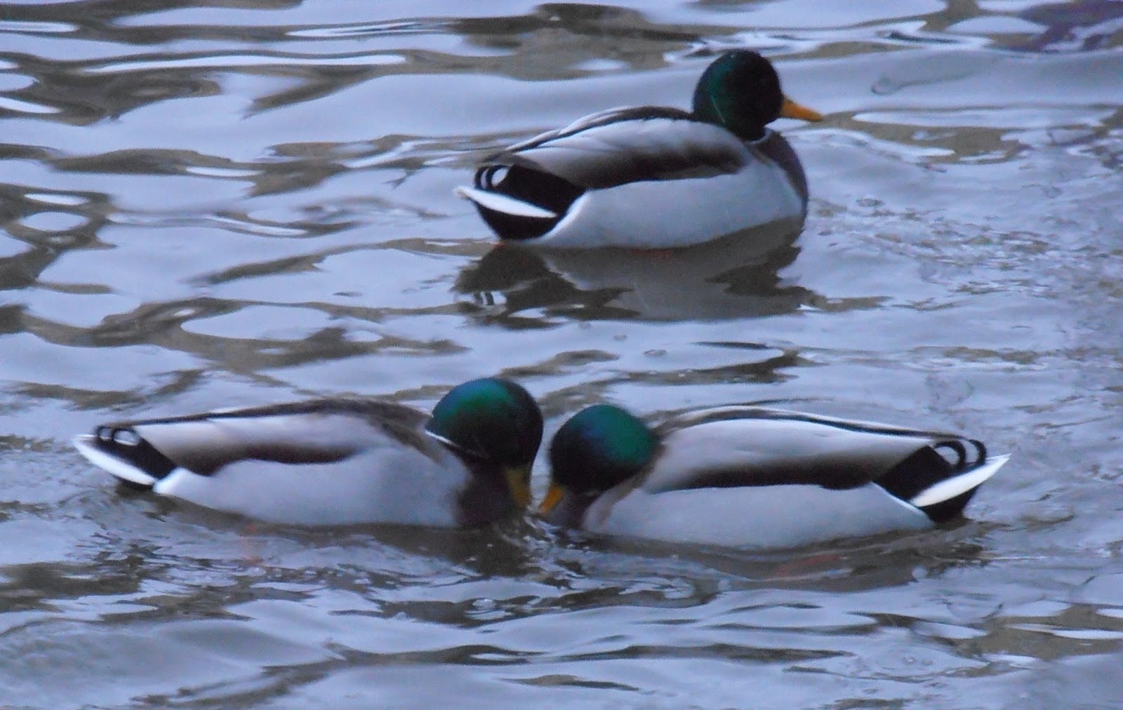 Tre gräsandspojkar i dammen. Lite bråk om damerna är det.