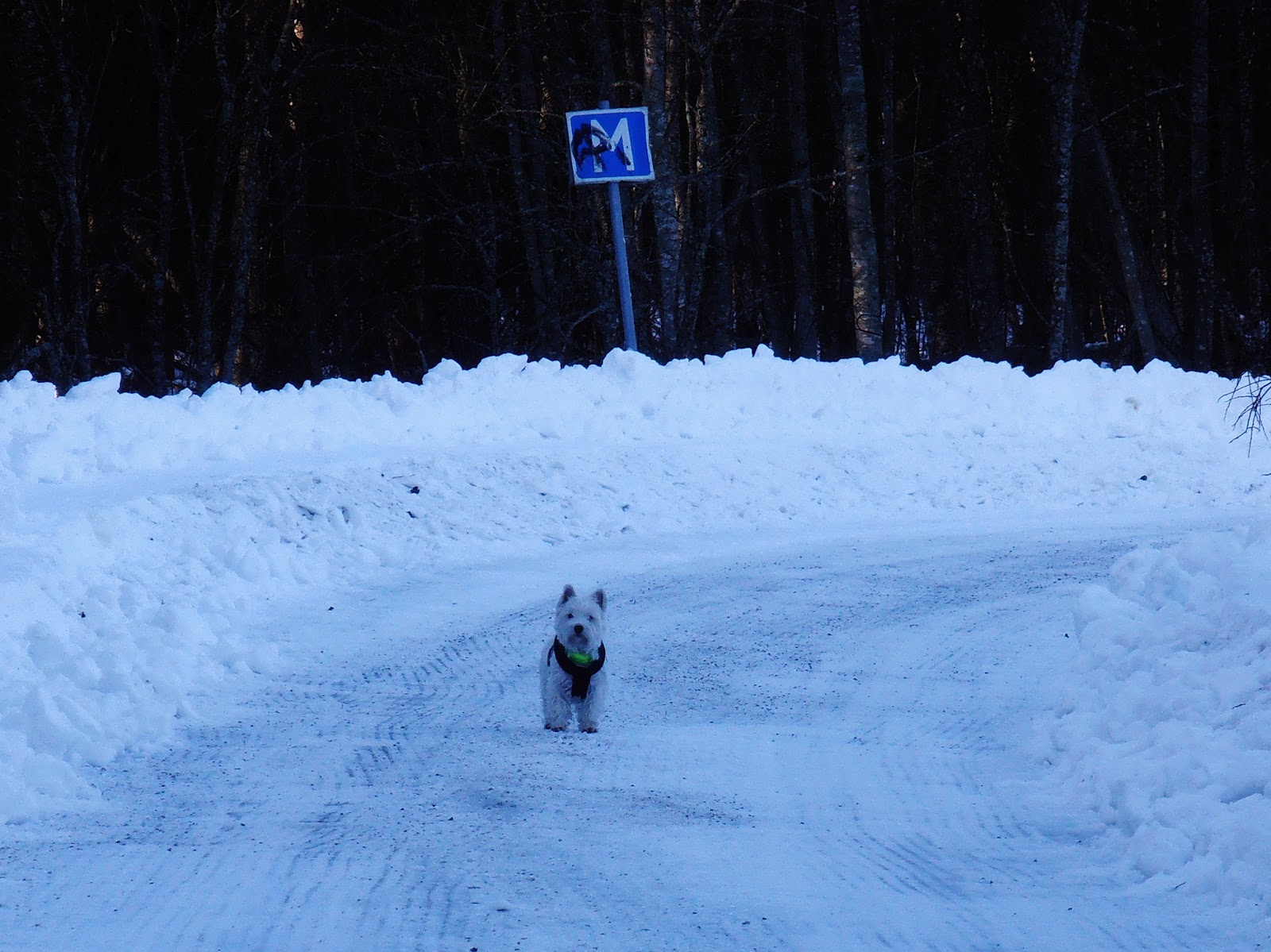 Senare möter jag en duva som flyger upp från den gnistrande snön som är prickig av små isblänk, det är också en prick i duvans öga.
